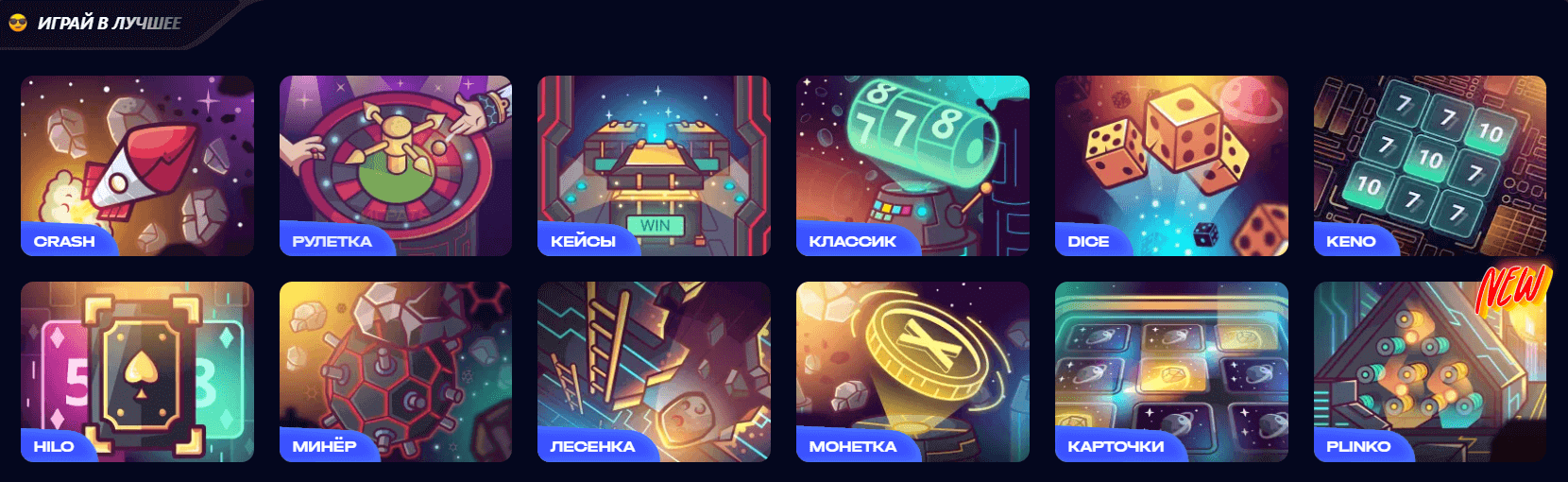 - эксклюзивные игры — Кейсы, Лесенка, Рулетка, Dice, Минер, Карточки.
